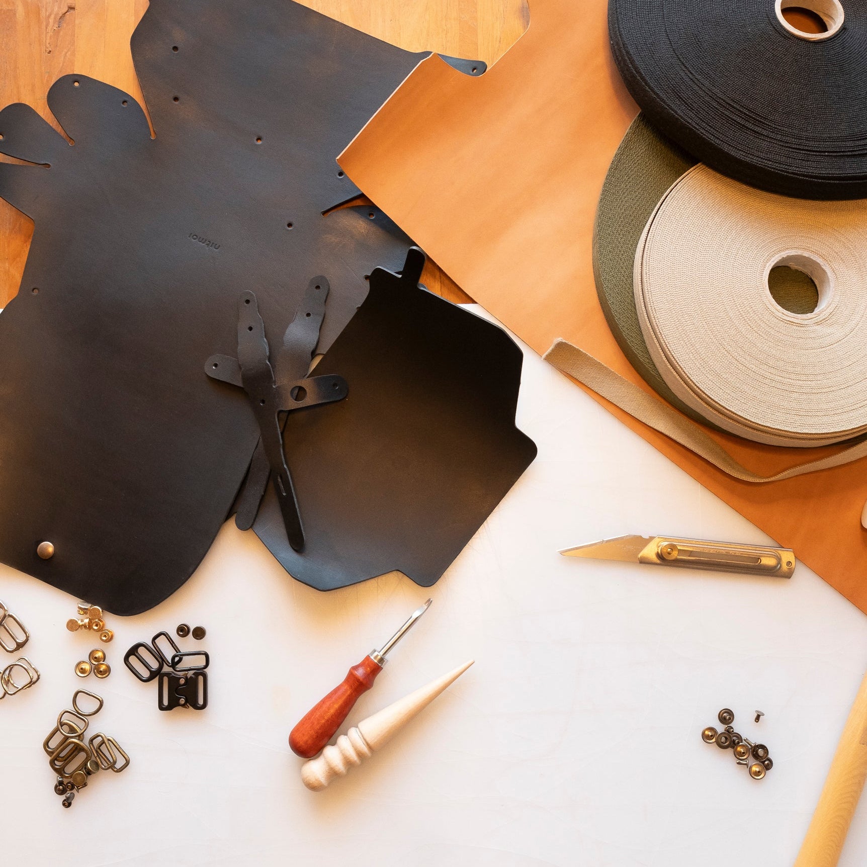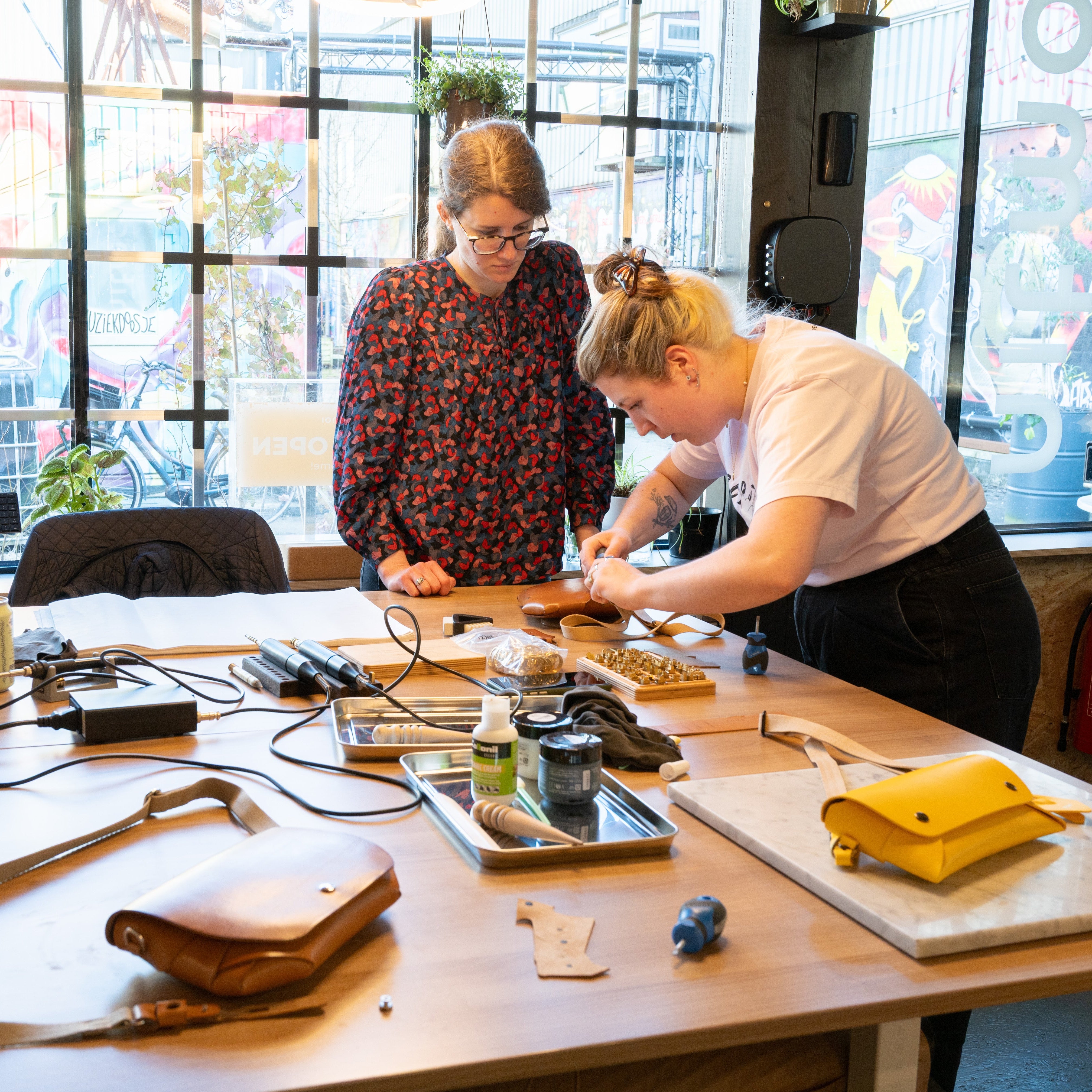 The workshops include the use of all the tools and materials to be able to make a beautiful Nitmoi bag. This means premium Italian leather for the bag, all the metal parts and a nylon strap with all its parts. Plus the workshop also includes coffee, tea, drinks and some snacks!